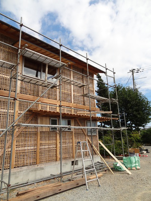 急いでお昼までに西側の野地板が貼り終えました