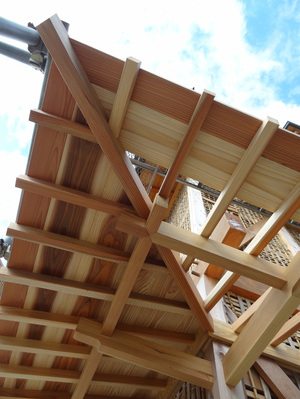 広木舞を取り付けて垂木を切り揃えて野地板を貼ると